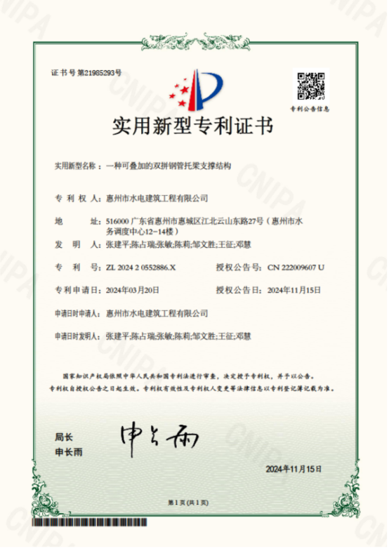 近日,由市成人性爱片 水电公司自主研发的“一种可叠加的双拼钢管托梁支撑结构”获国家知识产权局授予实用新型专利证书,标志着公司在创新发展的道路上又向前迈进坚实一步。