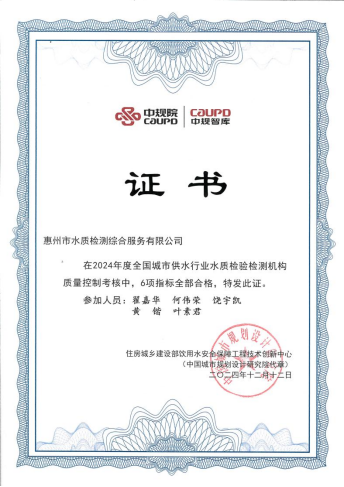 近日,2024年度全国城市供水行业水质检验检测机构质量控制考核结果公布,惠州市大禹工程质量检测中心有限公司水务环境事业部(惠州市水质检测综合服务有限公司)参加的“铝、三氯甲烷、三溴甲烷、一氯二溴甲烷、二氯一溴甲烷、高氯酸盐”等6个项目质控考核全部合格,获得住房城乡建设部饮用水安全保障工程技术创新中心授予的“质量控制考核6项指标全部合格”证书。