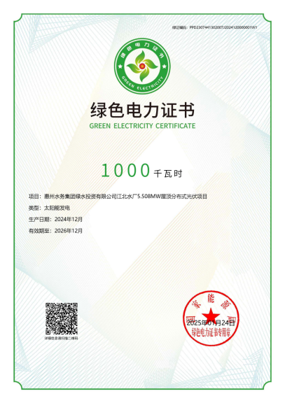 近日,绿水公司在企业绿色低碳发展方面传来喜讯,由绿水公司投资建设的江北水厂5.508MW屋顶分布式光伏项目正式获得由国家能源局-国家绿证核发交易系统核发的37张绿色电力证书。这标志着绿水公司2025年在涉水新能源领域经营赢得开门红,迈出了重要一步。
