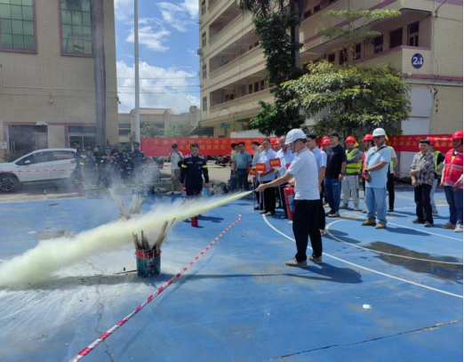 •灭火器实操演练 参训人员分组使用干粉灭火器扑灭油盆火,谭教官现场纠正操作误区,强调“提、拔、握、压”四步法,确保每位员工都能正确使用消防器材。