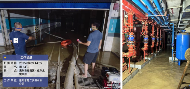 在惠阳区委、区政府统一领导部署下,惠阳水务启动一级应急响应,集结抢险队伍、备齐材料,准备随时抢修。为保障群众用水,公司主动与政府、物业协调,派出人员、提供技术,助力相关小区早日恢复供水。此次抢险难度远超预期:多个受淹地下室面积大、积水深,排水系统瘫痪,排水时间长;洪水退后室内有害气体严重超标,抢修难度增大;供水设备长时间浸泡受损,清淤检修要在泥泞积水中进行,给抢修人员带来极大考验。