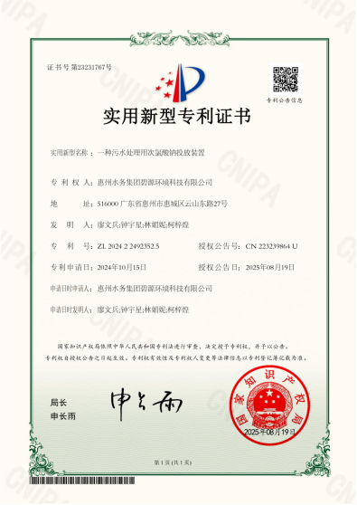 继连续斩获四项污水、污泥处理相关技术专利后,惠州水务集团碧源公司在水务环保技术创新领域再传捷报。8月19日,由碧源公司自主研发的“一种污水处理用次氯酸钠投放装置”荣获国家知识产权局授予专利权并颁发实用新型专利证书。至此,公司已在水务环保领域累计斩获五项国家授权专利,涵盖污水、污泥处理等多个关键技术环节。