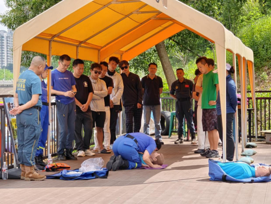 蓝天救援队结合近期发生的溺水和救援案例,现场拆解“黄金四分钟”,他们带领景区和经营业态工作人员分组练习,从清理呼吸道、开放气道到精准按压,逐一纠正手势偏差。全域覆盖从“专业队”到“全员兵”的安全共识。接着,桨板运动协会与蓝天救援队分别对桨板救援、绳包救援、徒手救援等进行了系统化的培训,景区内各业态的工作人员也积极地参与了救援实践的学习。