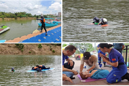 8月22日上午9时,桃花源游客服务中心联合惠州市蓝天救援队、惠州市桨板运动协会在桃花源水上运动中心开展“防溺水专项应急演练”。此次演练统筹组织了景区保安、水上项目全体员工、经营业态负责人等30余人,围绕“发现—呼救—救援—医疗”全链条开展实战化水上安全救援演练。
