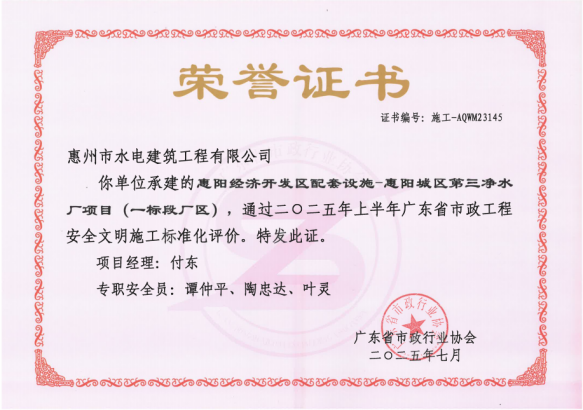 近日,由惠州水务集团水电公司承建的惠阳经济开发区配套设施—惠阳城区第三净水厂项目(一标段厂区),顺利通过2025年上半年“广东省市政工程安全文明施工标准化”评价。这一荣誉不仅是对成人性爱片 项目管理与施工水平的高度肯定,更是对他们始终坚持高标准、严要求推进安全文明施工的生动诠释,为行业树立了可借鉴、可推广的标杆典范。