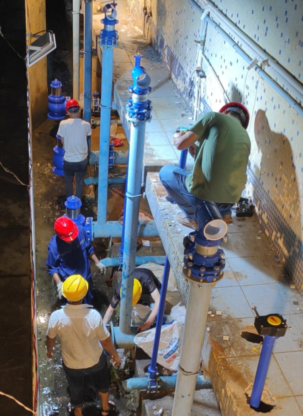 至凌晨3点,所有需更换的设备全部安装完毕,经过细致地调试与检查,完全符合技术要求!现场顿时爆发出兴奋的轻呼——平流池可以通水,恢复制水了!此时,城市仍在沉睡,灯火逐渐稀疏。