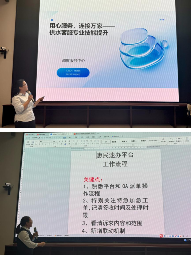 11月4日上午,市供水公司调度服务中心组织开展了一场“干货”满满、直击一线诉求的供水服务专题业务培训。此次培训聚焦客服热线与网络问政核心业务,既有班组长“手把手”精准施教沟通与投诉的化解技巧,更直面新形势下的新要求,通过复盘热线录音、梳理“惠民速办”平台联动流程等方式,为零距离破解服务痛点、解锁实战新技能提供了务实管用的行动指南。