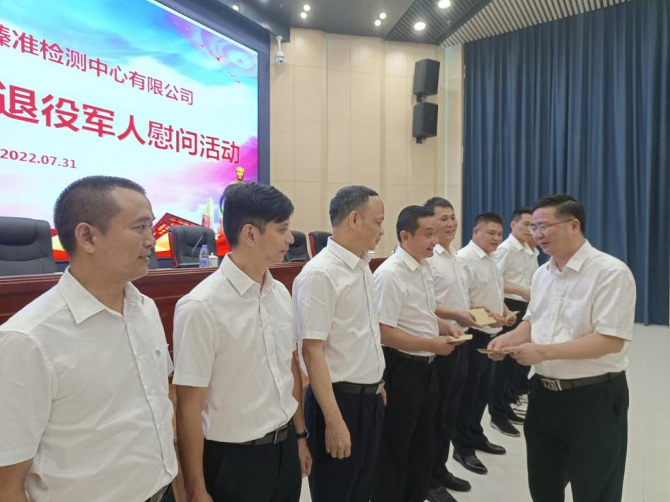 检测中心党支部书记、董事长李小鸿代表中心向退役军人员工送上节日问候并发放慰问金,感谢他们服兵役时保家卫国、英勇战斗、无私奉献,赞扬他们退伍复员后到企业继续发扬服从命令听指挥的部队精神和冲锋一线、吃苦耐劳的革命精神。