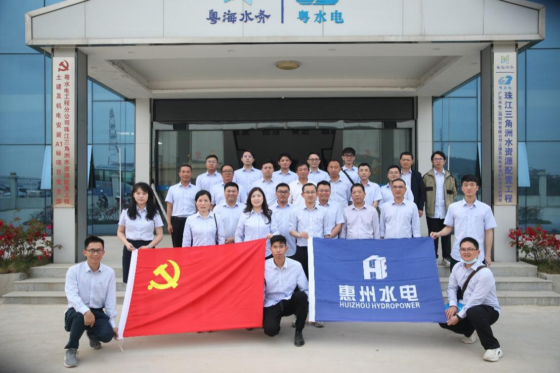 机关党支部党员与各在建项目技术人员代表共27人前往广东水电二局股份有限公司珠江三角洲水资源配置工程土建及机电安装A1标项目(输水起点)鲤鱼洲岛开展观摩主题党日活动。